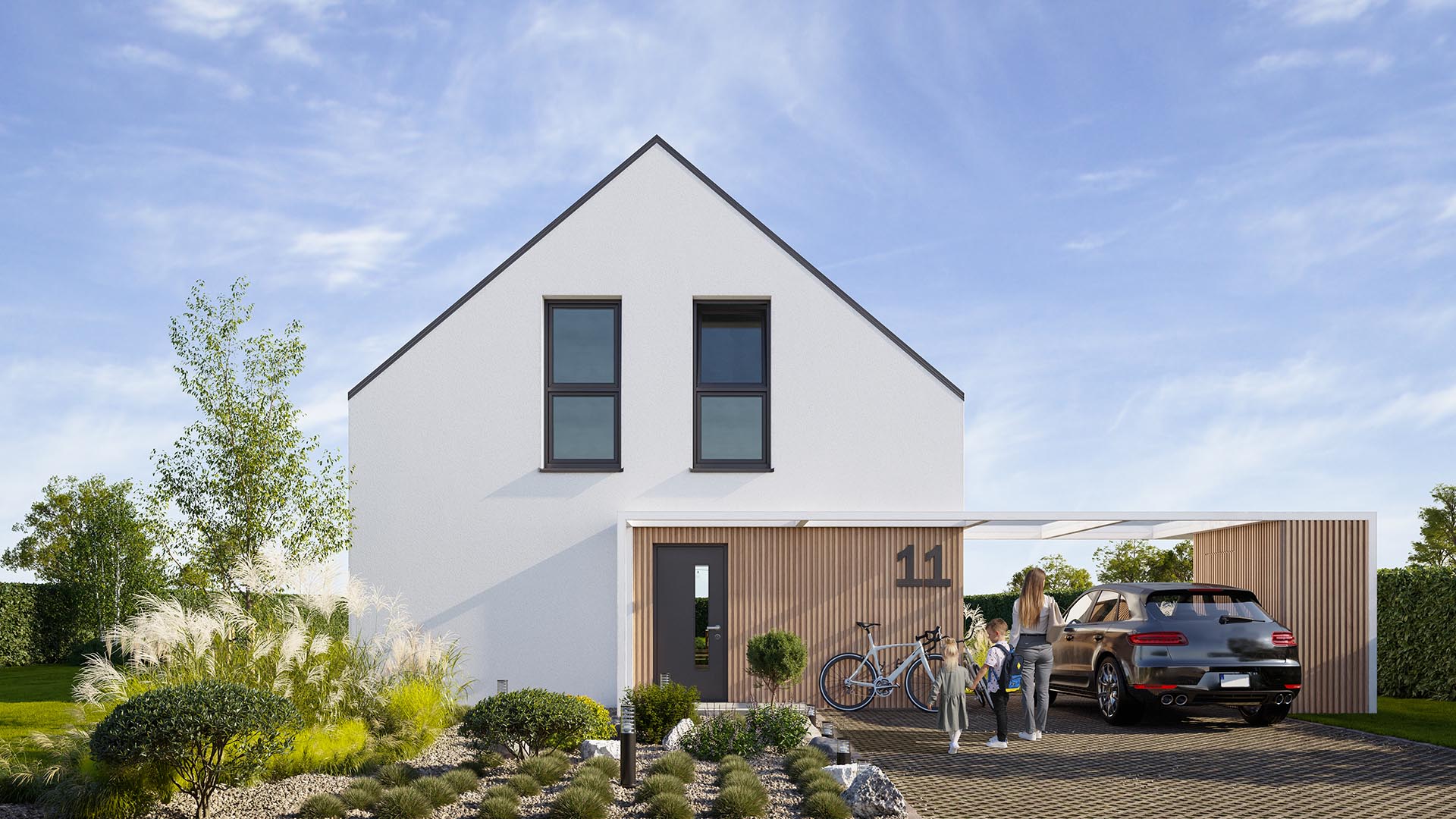Na zewnątrz zlokalizowano pomieszczenie gospodarcze na rowery, które zostało połączone płaskim nowoczesnym dachem z główną bryłą budynku, dzięki czemu powstało osłonięte miejsce parkingowe oraz zadaszone dojście do domu.
