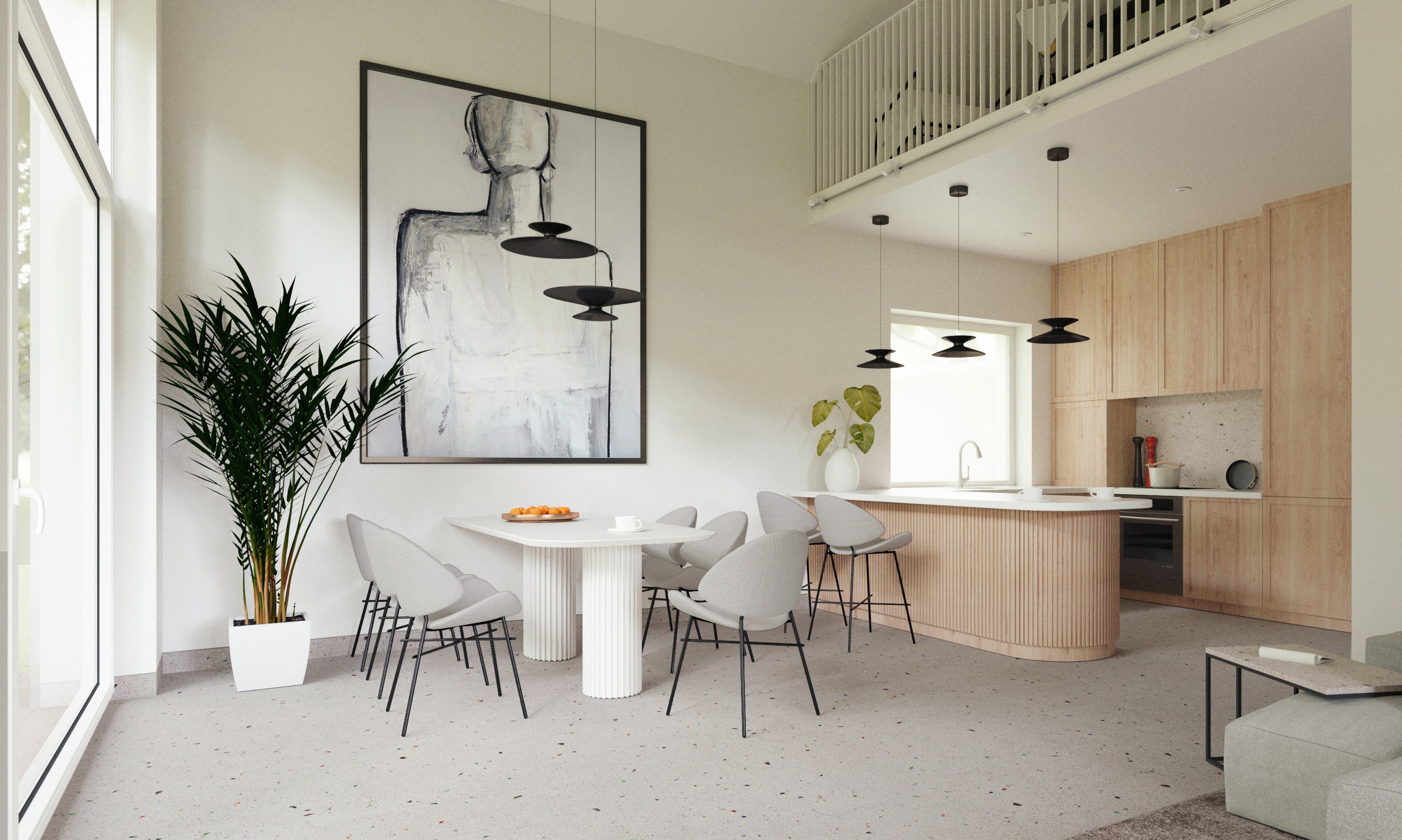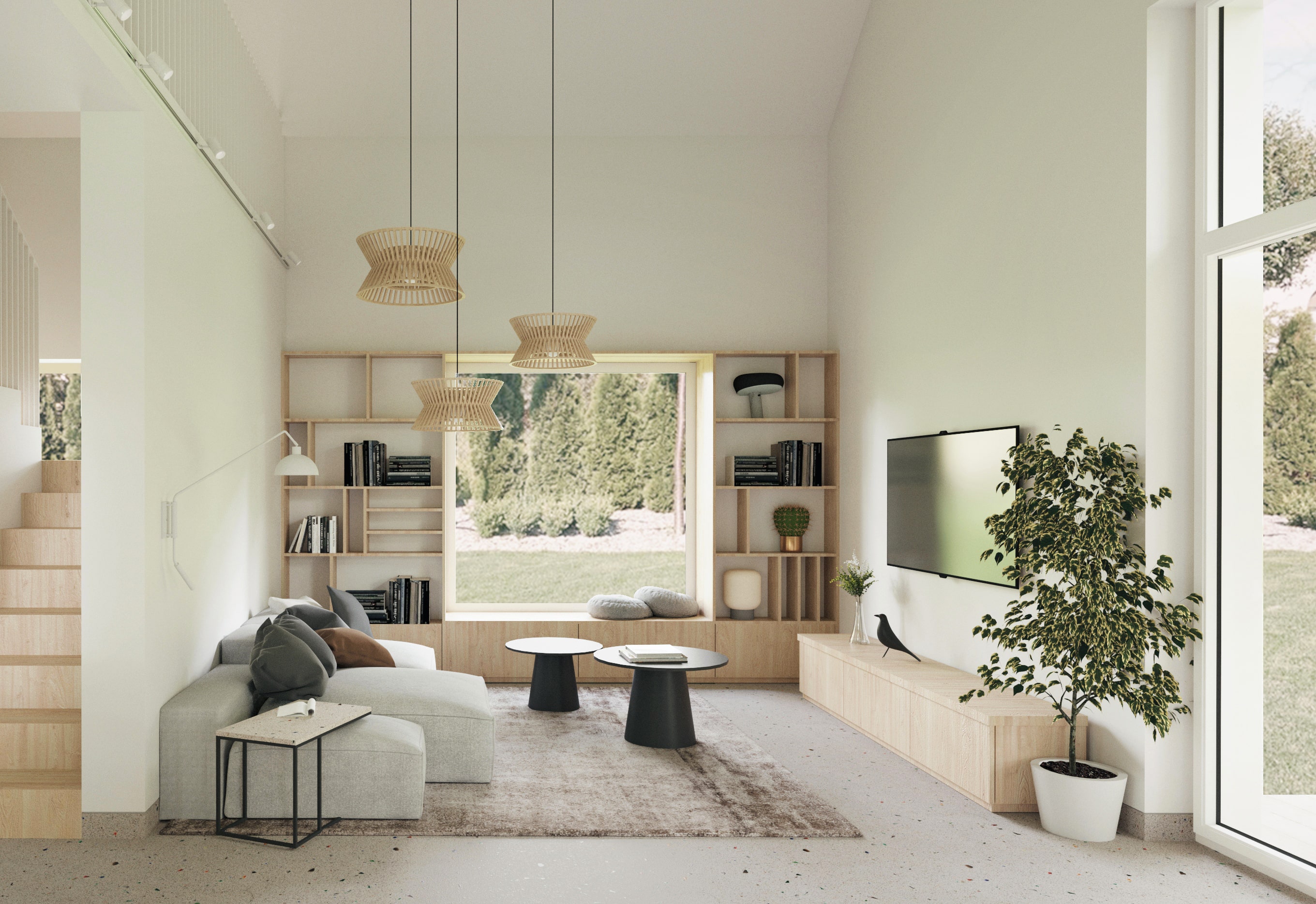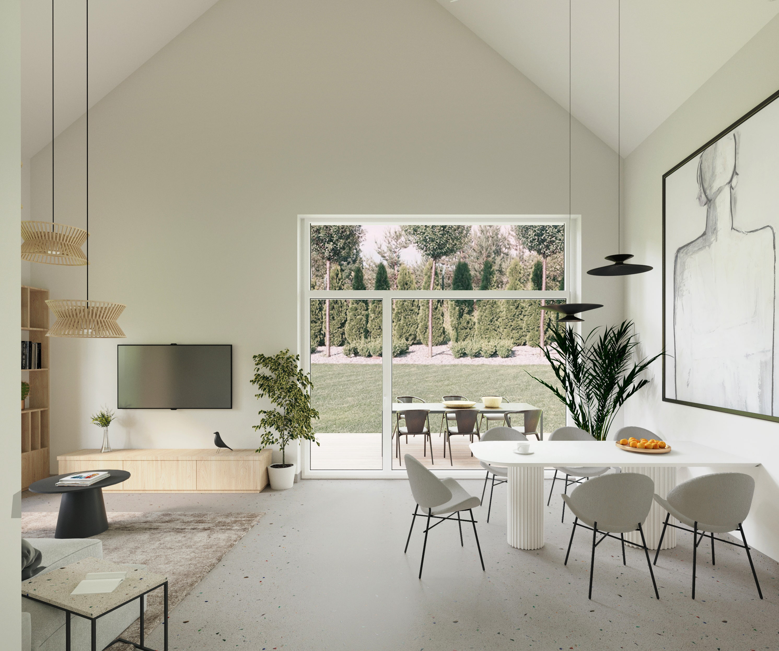Energooszczędna i zwarta bryła w połączeniu z wysokim salonem świetnie realizuje to zadanie. Duże przeszklenia dają wspaniały widok na ogród, naturalne światło w pomieszczeniach i umożliwiają powiększenie strefy rekreacyjnej salonu w ciepłe dni o część tarasu. Projekt stawia przede wszystkim na części wspólne, jako serce budynku i tło dla codziennego życia.