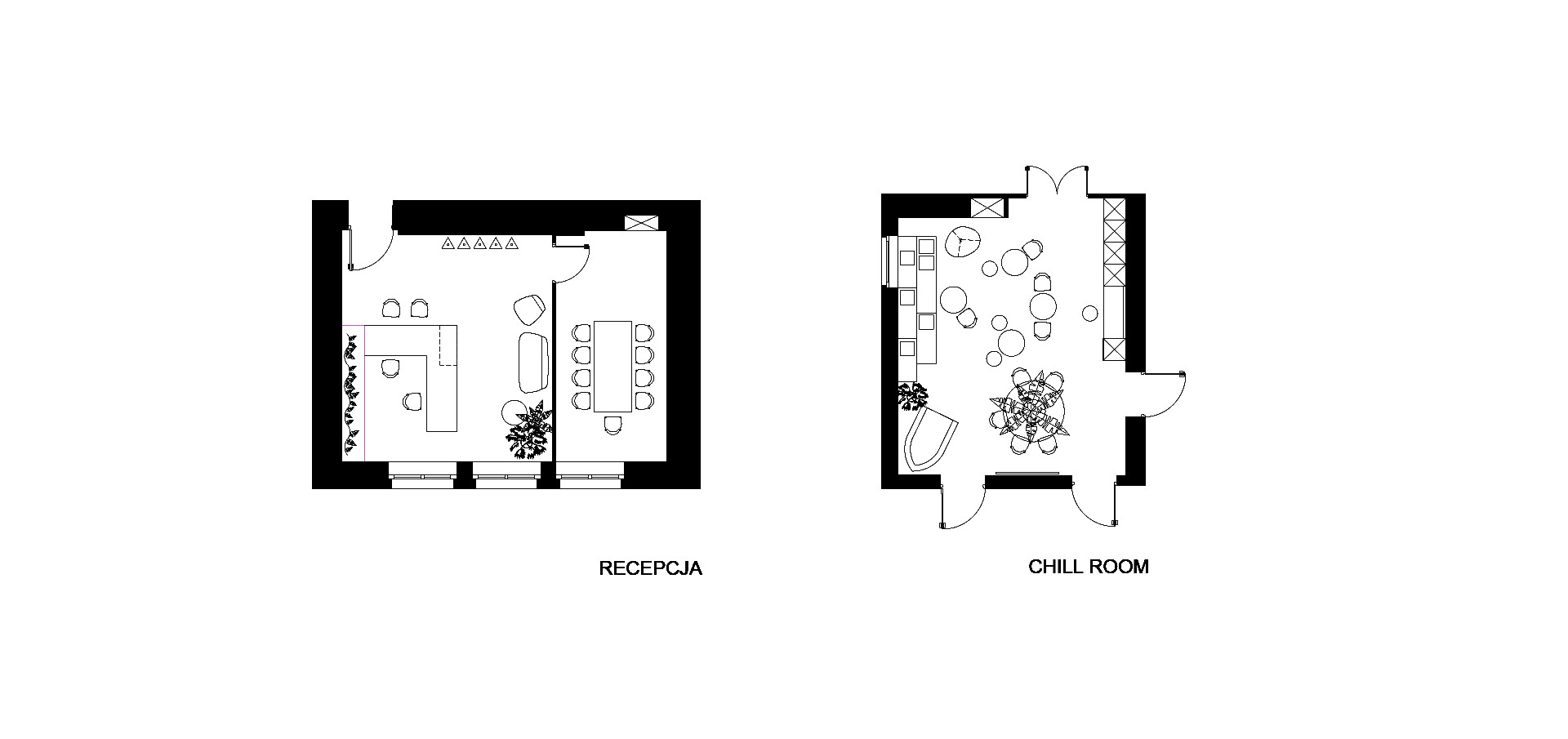 Wspólnym mianownikiem jest bliski firmie motyw wody, który w recepcji zdefiniowany jest za pomocą odbijających materiałów i akwarium, a w chillroomie przejawia się bardziej dosłownymi nawiązaniami - łódką, neonami, różą wiatrów czy mapami.