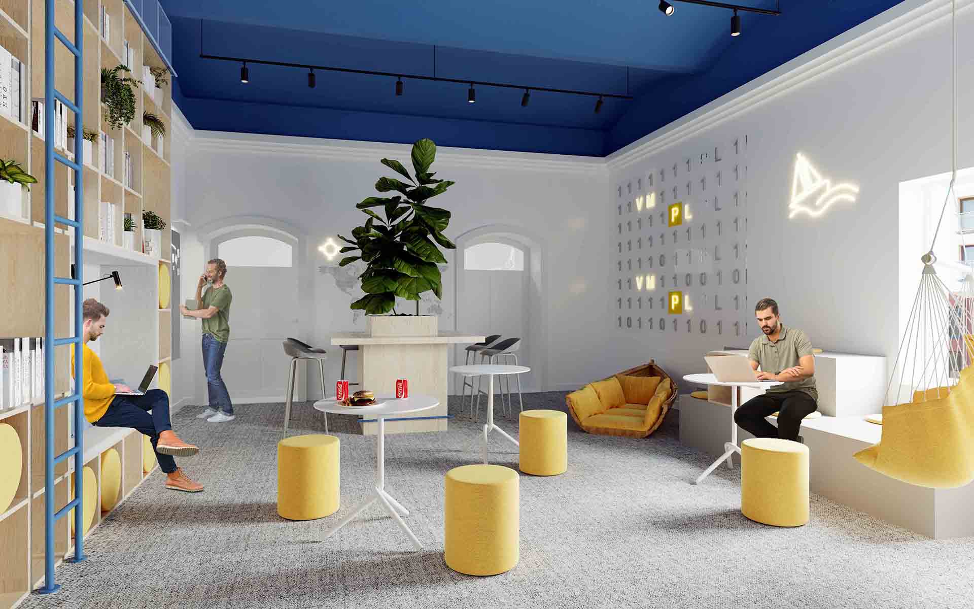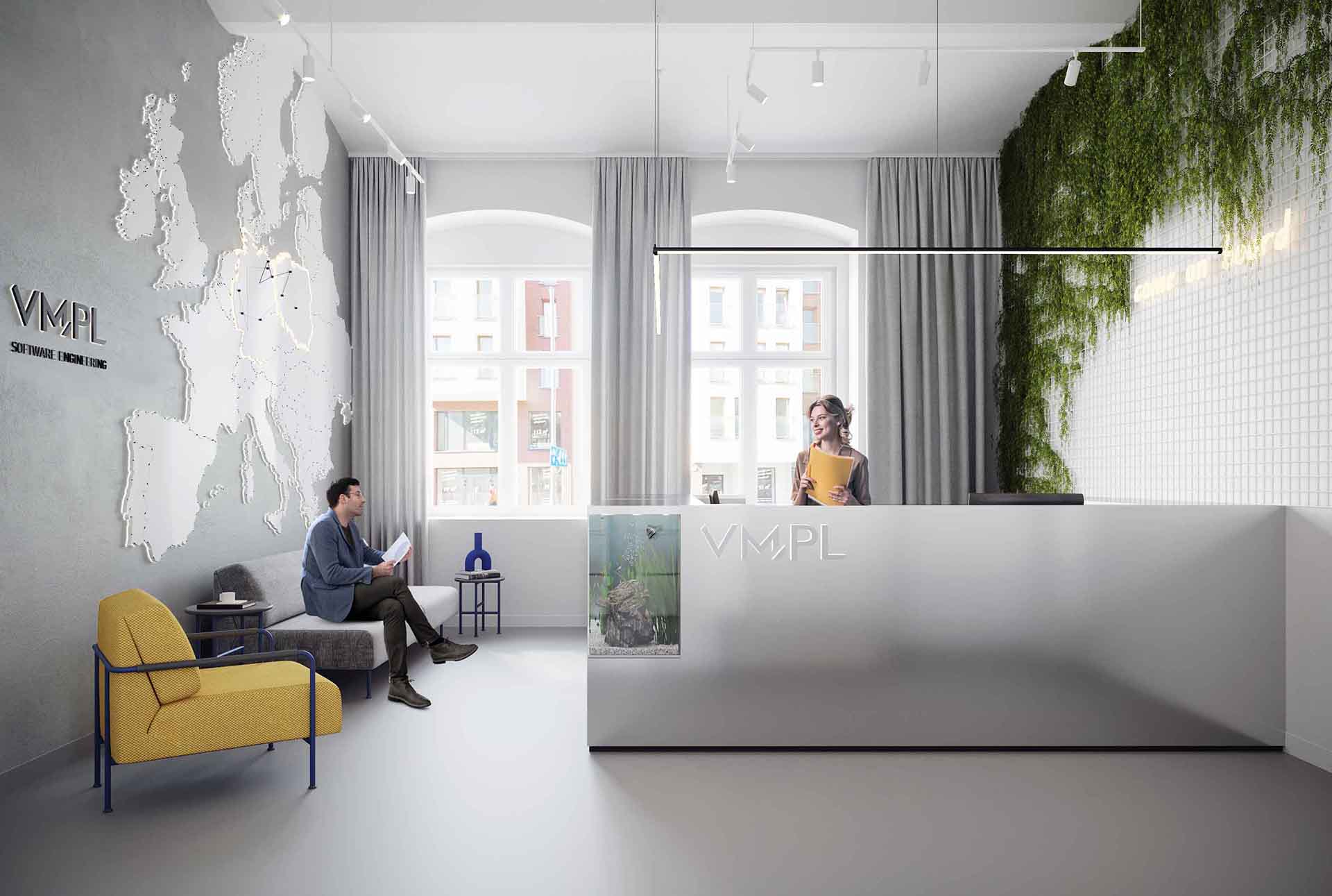 Zależało nam na reprezentacyjnym charakterze recepcji oraz luźnej i nieformalnej stylistyce przestrzeni wspólnej, przy zachowaniu spójnych elementów takich jak szara baza, światło, żółte akcenty, niebieskie rurki.